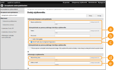 Jeśli nazwa użytkownika jest numeryczna i składa się z siedmiu cyfr lub mniej, ten sam numer jest przypisywany do tego samego użytkownika jako identyfikator wydziału. Jeśli hasło tego samego użytkownika jest zarejestrowane jako numer, który składa się z siedmiu cyfr lub mniej, jest ono również ustawiane jako kod PIN dla tego identyfikatora wydziału.