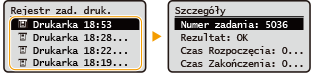 wybierz dokument, którego historię chcesz sprawdzić.Komunikat <OK> jest wyświetlany po pomyślnym wydrukowaniu dokumentu. Jeżeli natomiast drukowanie dokumentu nie powiedzie się, ponieważ zostało anulowane lub wystąpił błąd, na ekranie pojawi się komunikat <Błąd>.