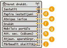 Izmantojot šo pogu, var piekļūt daudziem iekārtas iestatījumiem, piemēram, <Funkciju iestatījumi> un <Preferences>.