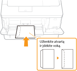 Vokus dėkite į popieriaus stalčių ar universalųjį dėklą. Kai spausdinate ant vokų, tam, kad popierius neįstrigtų ir nesiglamžytų, prieš dėdami vokus išlyginkite visus nelygumus. Be to, atkreipkite dėmesį į vokų padėtį ir į viršų nukreiptą pusę. Atminkite, kad nei vokų, nei atvirukų negalima dėti į popieriaus stalčių.