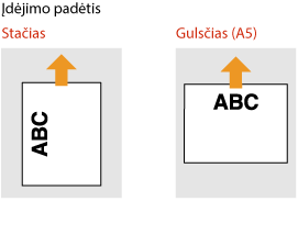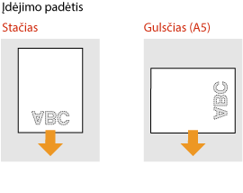 Įdėjimo būdas skiriasi atsižvelgiant į tai, ar popieriaus su logotipu padėtis yra stačia, ar gulsčia. Įdėkite lapus nukreipę logotipą (spausdinama pusę) žemyn kaip nurodyta tolesnėse iliustracijose.