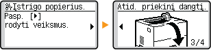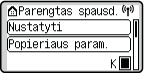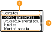 Galite keisti ekrano rodymo parametrus, tokius kaip, kurį ekraną rodyti pirmą įjungus aparatą, taip pat ar rodyti pranešimą apie likusio popieriaus ir dažomųjų miltelių kiekį. <Rodymo parametrai>