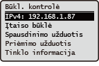 (Būsenos ekranas), rodomas ekranas <Būkl. kontrolė>. Šiame ekrane galite patikrinti spausdinimo būseną ir dažomųjų miltelių likutį.