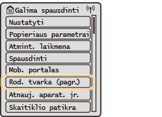 (Pagrindinis). Kai ekranas <Pagrindinis> arba parametrų ekranas rodomas aparato ekrane, galite inicijuoti funkcijas, tokias kaip <Atmint. laikmena> ir <Mob. portalas>. Be to, ekraną galite naudoti informacijai peržiūrėti, pvz., klaidų pranešimus ir aparato veikimo būseną.
