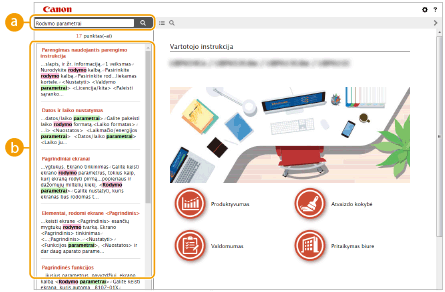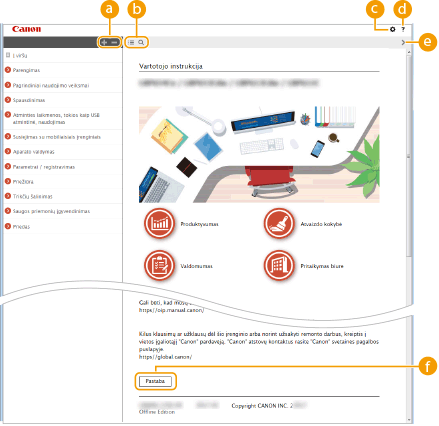 Spustelėkite, jei norite pamatyti, kaip peržiūrėti Vartotojo instrukcija, atlikti paiešką ir kitą informaciją.