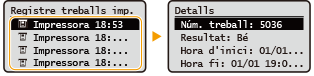seleccioneu el document per comprovar-ne l'estat.<Bé> es mostra quan un document s'ha imprès correctament i <Error> es mostra quan un document no s'ha pogut imprimir perquè s'ha cancel·lat o s'ha produït algun error.