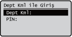 Departman Kimliği Yönetimi uygulanmadığındaDepartman Kimliği Yönetimi olmadan yalnızca Sistem Yöneticisi Kimliği ve PIN ayarlandığında makinede yalnızca yönetici yetkisi gerektiren ayarları yapılandırmak istediğinizde oturum açmanız gerekir. <Sistem Yöneticisi Kml.> ve <Sist. Yöneticisi PIN'i> kısımlarına Kimlik ve PIN'i girip