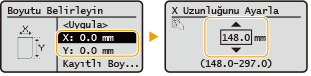 <X> veya <Y> alanını seçerek sayısal tuşlarla veya  /  tuşlarıyla her iki tarafın uzunluğunu belirtin.