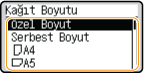 Yüklenecek kağıdı sıklıkla değiştirmeniz gerekiyorsa <Serbest> olarak ayarlamak, ayarın değiştirilmesi için her seferinde gereken adım sayısını azaltır. Ancak, yazıcı sürücüsündeki kağıt türü ayarı ile makineye gerçekte yüklenen kağıt türü aynı olmasa bile, bu ayar seçiliyken makinenin yazdırmaya devam edeceğini unutmayın.