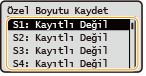 En fazla beş sık kullanılan serbest boyutlu kağıt kaydedebilirsiniz. Buraya kayıtlı kağıt boyutları, kağıt çekmecesi ve çok amaçlı tepsi için kağıt boyutu seçim ekranında görüntülenir (Kağıt Çekmecesinde Kağıt Boyutunu ve Türünü Belirtme veya Çok Amaçlı Tepsideki Kağıt Boyutunun ve Türünün Belirtilmesi).