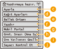 <Ana Menü> Ekranında Görüntülenen Öğeler