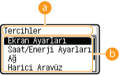 Geçerli menü düzeyine ait olan ayar öğeleri bir listede görüntülenir.