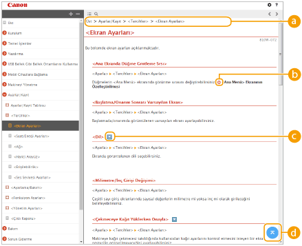 Kullanıcı Kılavuzu için metin boyutu, düzen ve görüntüleme yöntemi gibi ayarları belirtmek için tıklatın.