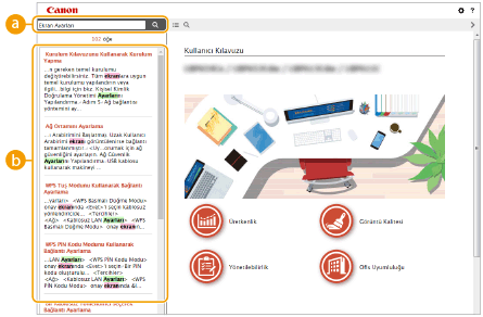Belirtilen anahtar sözcükleri içeren sayfaların arama sonuçlarını görüntüler. Bu sonuçlardan, aradığınız sayfayı belirleyin ve sayfanın konu başlığına tıklayın.