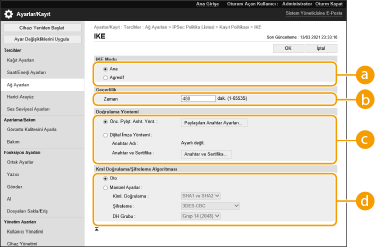 IKE aşama 1 için kimlik doğrulama ve şifreleme algoritmasının nasıl belirtileceğini ayarlamak için [Oto] veya [Manüel Ayarlar] seçeneğini belirleyin. [Oto] seçeneğini belirlerseniz hem bu makine hem de iletişim eşi tarafından kullanılabilen bir algoritma otomatik olarak ayarlanır. Belirli bir algoritma belirtmek isterseniz [Manüel Ayarlar]'ı seçip aşağıdaki ayarları yapılandırın.