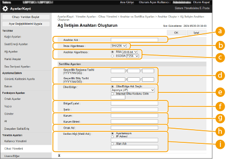 Anahtar oluşturma algoritması olarak [RSA] veya [ECDSA] seçeneğini belirleyin. [RSA] seçtiyseniz anahtar uzunluğunu; [ECDSA] seçtiyseniz anahtar türünü seçin. Her iki durumda da değer yükseldikçe güvenlik artar ancak iletişim işleme hızı azalır.