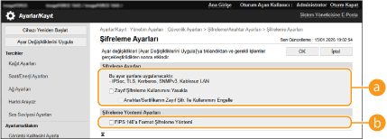 [FIPS 140'a Format Şifreleme Yöntemi]'ni seçerseniz, TLS iletişim şifreleme yöntemini ABD devleti onaylı FIPS (Federal Bilgi İşlem Standartları) 140 ile uyumlu hale getirebilirsiniz, ancak aşağıdaki sınırlamalar geçerlidir.