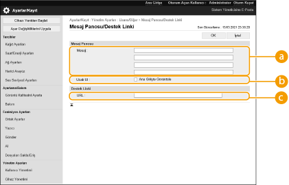 Makinenin Uzak Kullanıcı Arabirimi'nin portal sayfasında görüntülenmesi için destek bilgileri bağlantısını girin.