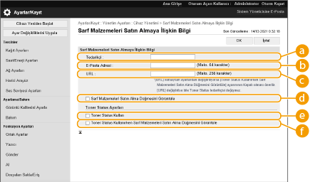 Uzak Kullanıcı Arabirimi'nden sarf malzemeleri bilgileri kontrol edilirken görüntülenen, sarf malzemeleri satın almak için web sitesine bir bağlantı ayarlayabilirsiniz. Web sitesine bir bağlantı oluşturmak, kullanıcıların sarf malzemeleri satın almasını kolaylaştırır.