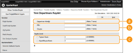 Administrator ayrıcalıklarına sahip bir kullanıcı olarak oturum açarsanız Sistem Yöneticisi Kimliği ve PIN’i otomatik olarak atanır ve Departman Kimliği olarak yönetilir.
