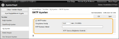 SNTP'Yi kullanarak makine ile kayıtlı bir sunucu arasındaki iletişim durumunu denetleyebilirsiniz. Ancak yalnızca iletişim durumu doğrulanır, saat ayarlaması yapılmaz.