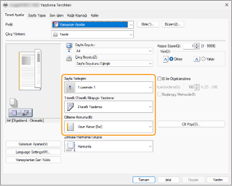 Baskı önizlemesini kontrol ederken [Sayfa Yerleşimi] [Sayfa Sırası] [1 taraflı/2 taraflı/Kitapçık Yazdırma] [Ciltleme Konumu] öğelerini ayarlayın.