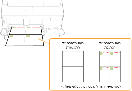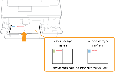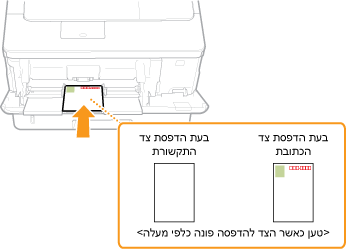 הכנס גלויה כאשר צד ההדפסה פונה מעלה כשהקצה הקצר פונה לכיוון המכשיר אם סוג הגלויה הוא סוג רגיל או 4-on-1 או כשהקצה הארוך פונה לכיוון המכשיר אם סוג הגלויה הוא reply.