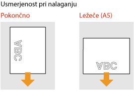 To poglavje vsebuje navodila za vlaganje predhodno natisnjenega papirja v pravilni usmerjenosti. Opis splošnega postopka nalaganja papirja v kaseto za papir ali večnamenski podstavek najdete v poglavju Osnovni načini vlaganja papirja.