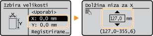 Vnesite dolžino strani <X> in strani <Y>. Izberite <X> ali <Y>, da s številskimi tipkami ali