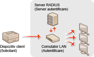 Dacă un dispozitiv încearcă să se conecteze și să înceapă să comunice pe o rețea 802.1X, dispozitivul trebuie să treacă prin autentificarea utilizatorului pentru a demonstra că acea conexiune este realizată de un utilizator autorizat. Informațiile de autentificare sunt trimise către și verificate de un server RADIUS, care permite sau respinge comunicarea cu rețeaua în funcție de rezultatele autentificării. Dacă autentificarea eșuează, un switch LAN (sau un punct de acces) blochează accesul din exterior la rețea. Aparatul se poate conecta la o rețea 802.1X ca un dispozitiv client.