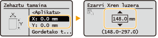 Hautatu <X> edo <Y> alde bakoitzeko luzera zehazteko zenbaki-teklak edo  /  erabiliz.