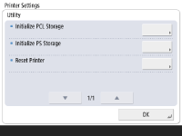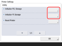 The storage cannot be initialized in the following conditions: When print data is being received or printed. (It is recommended that you remove the cable connecting the machine to the hub, so it does not receive print data.) When fonts are being installed or uninstalled. The steps explained below are for initializing the PCL storage area. To initialize the PS storage area, follow the same steps, except that for step 4, select [Initialize PS Storage]. |