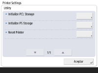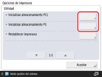 El almacenamiento no se puede inicializar en las siguientes condiciones: Cuando se están recibiendo o imprimiendo datos. (Se recomienda quitar el cable que conecta el equipo al concentrador para que la misma no reciba datos de impresión). Cuando se están instalando o desinstalando fuentes. Los pasos explicados a continuación son para inicializar el área de almacenamiento PCL. Para inicializar el área de almacenamiento PS, siga los mismos pasos excepto el paso 4, donde deberá seleccionar [Inicializar almacenamiento PS]. |
