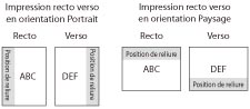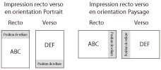 Ce réglage permet de déterminer si la position de reliure se situe sur le bord long ou sur le bord court des feuilles. En cas de reliure avec impression recto verso, l'orientation de l'image est automatiquement réglée sur la mise en page correcte.