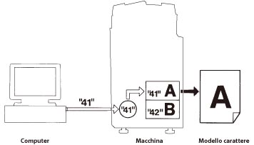 Quando si stampa la lettera A, il computer invia alla macchina un codice corrispondente ad A (esadecimale 41 in questo caso). Questo codice viene chiamato codice di carattere. La macchina memorizza la rappresentazione di ciascun carattere e seleziona tra i modelli di carattere quello corrispondente al codice ricevuto. In questo caso, la macchina cerca il modello per A, quindi stampa il carattere. Sistema con cui i caratteri vengono stampati.