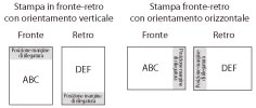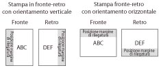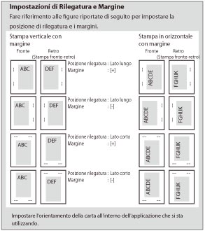 Questo parametro crea un margine per la rilegatura sul lato più lungo o sul lato più corto dei fogli. Quando si imposta la rilegatura per le stampe in fronte-retro, l'orientamento dell'immagine viene regolato automaticamente per ottenere il layout corretto.