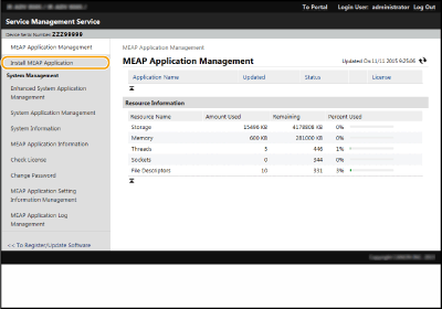 Puteți verifica numărul de aplicații instalate și spațiul utilizat pe dispozitivul de stocare. Administrarea aplicaţiilor MEAP Dacă aplicaţia MEAP nu este livrată cu un Număr de acces licenţă, fişierul dvs. de licenţă va fi asigurat de către furnizorul Aplicaţiei MEAP. Cheia de licenţă şi fişierul de licenţă descrise în prezenta secţiune nu sunt necesare. Pentru mai multe informaţii, citiţi manualul furnizat cu fiecare aplicaţie MEAP. În funcție de aplicația MEAP, poate fi necesară o anumită condiție pentru instalare. Pentru mai multe informații, consultați manualul de utilizare al aplicației MEAP care urmează să fie utilizată. Se pot instala maximum 19 aplicaţii MEAP pe acest aparat. |