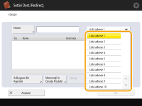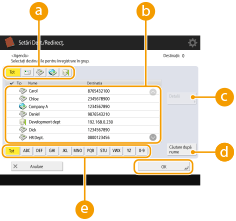 2 | Selectaţi destinaţiile pe care doriţi să le înregistraţi într-un grup şi apăsaţi <OK>. ![]() Buton de tip de destinațieSelectaţi (e-mail), (I-fax) sau (fişier) pentru a filtra destinaţiile afişate în lista de adrese ( ). Apăsaţi <Tot> pentru a afişa toate destinaţiile înregistrate. DestinaţieSe afişează destinaţiile înregistrate în lista de adrese pe care aţi selectat-o la pasul 6. Din această listă, selectaţi destinaţiile pe care doriţi să le înregistraţi într-un grup. ![]() Atunci când destinaţiile sunt gestionate prin numere de acces, acestea nu se afişează în listă decât dacă introduceţi numărul de acces (Restricţionarea accesului la destinaţiile înregistrate în Agendă) după ce aţi apăsat <Nr. de acces>. <Detalii/Editare>Selectaţi o destinaţie şi apăsaţi <Detalii/Editare> dacă doriţi să verificaţi setările destinaţiei. Apăsaţi <OK> pentru a reveni la ecranul anterior. <Căutare după nume>Introduceţi numele destinaţiei. Apăsaţi din nou <Căutare după nume> pentru a reveni la ecranul anterior. Butonul primei litereSelectaţi butonul alfanumeric pentru primul caracter al numelui destinaţiei. Apăsaţi <Tot> pentru a afişa toate destinaţiile înregistrate. |