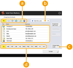 Pentru administratorAgenda şi butoanele rapide pot fi exportate/importate. Această funcţie poate fi utilizată pentru a copia de rezervă datele în cazul apariţiei unei defecţiuni sau pentru a simplifica procedura de înregistrare a destinaţiilor între aparate compatibile. Pentru mai multe informații, consultați Copierea de rezervă/Restabilirea datelor. Agenda poate fi personalizată pentru fiecare utilizator conectat (Lista articolelor care pot fi personalizate). Mai mult, puteţi utiliza funcţia de sincronizare a setărilor personalizate pentru a activa partajarea Agendei de către un număr de imprimante multifuncţionale Canon (Sincronizarea setărilor pentru mai multe imprimante multifuncţionale Canon). Puteţi seta o parolă pentru a evita editarea sau ştergerea neautorizate din Agendă. Setarea unui PIN pentru Agendă Dacă există destinaţii care nu doriţi să se afişeze în Agendă sau dacă doriţi să limitaţi accesul utilizatorilor la destinaţii, introduceţi un număr de acces atunci când înregistraţi o destinaţie. Pentru a utiliza numărul de acces, este necesar să activaţi în avans setarea din Restricţionarea accesului la destinaţiile înregistrate în Agendă. Configuraţi listele de adrese ale grupurilor de utilizatori de la IU la Distanţă. (Înregistrarea destinaţiilor utilizând IU la distanţă) |