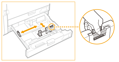 Culisaţi ghidajele până se aude un clic de poziţionare. Dacă ghidajul din stânga şi cel frontal nu sunt aliniate corect, formatul de hârtie nu va apărea corect pe afişajul panoului tactil. Trebuie de asemenea să reglaţi ghidajele corect pentru a evita blocajul de hârtie, murdărirea imprimatelor sau a interiorului aparatului.