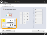 2 | Selectaţi tipul plicurilor încărcate în sertarul pentru hârtie. Dacă tipul de plicuri nu este corect setat, va apărea un blocaj de hârtie. Când utilizați plicuri cu dimensiuni personalizate, apăsați <Personalizat>  <Următorul>  introduceți dimensiunile plicului. Apăsați <X> sau <Y>  utilizați tastele numerice pentru a introduce lungimea dimensiunii respective. |