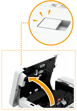 | Trageți maneta superioară pentru a deschide capacul zonei de scanare a documentelor. Deschideți ușor capacul, astfel încât să nu deteriorați sticla platoului. |