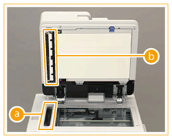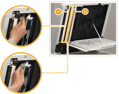 | Ștergeți zona de scanare de la alimentarea documentelor. Ștergeți banda din sticlă subţire  și placa albă  . Umeziţi o cârpă moale cu apă şi stoarceţi-o bine, apoi ştergeţi aparatul cu aceasta. Apoi, ştergeţi aparatul cu o cârpă moale şi uscată. Aşteptaţi până se usucă bine umezeala înainte de a trece la pasul următor. |