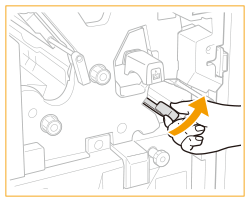 Dacă „Document Insertion Unit-R” este ataşat adiacent la dispozitivul de finisare, o parte a unităţii de inserare a documentelor poate interfera cu unitatea de finisare la eliminarea blocajelor. Ridicaţi unitatea de inserare a documentelor înainte de a elimina blocajele din dispozitivul de finisare. Aveţi grijă la manipularea echipamentelor opţionale ataşate la acest aparat. Când capacul unei unităţi opţionale este deschis pentru a înlocui un cartuş de capse, pentru a arunca deşeurile de perforare/tăiere/capsare sau pentru a debloca hârtia ori capsele, se pot produce încă imprimate dacă alte unităţi opţionale funcţionează normal şi nu sunt implicate în procedura de eliminare a blocajelor de hârtie sau capse.