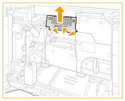 ![]() | Verificați dacă în interiorul unității de fixare au rămas bucăți de hârtie. Dacă rămân bucăți de hârtie, îndepărtați-le. ![]() |