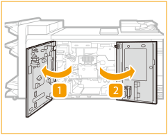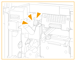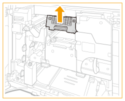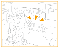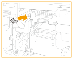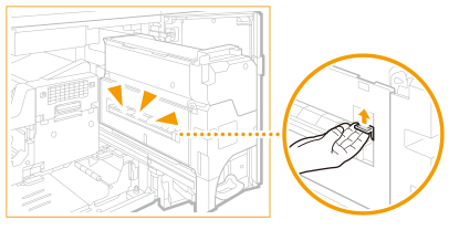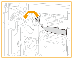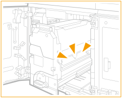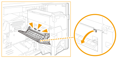 ![]() | Verificați dacă în interiorul unității de fixare au rămas bucăți de hârtie. Dacă rămân bucăți de hârtie, îndepărtați-le. ![]() |