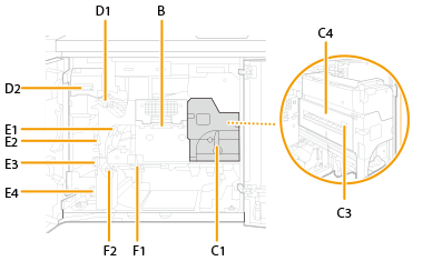 ![]() | Verificați dacă în ghidajul de alimentare (D1) au rămas bucăți de hârtie. ![]() |
