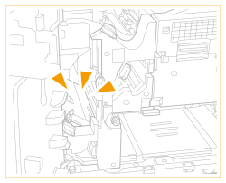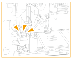 ![]() | Verificați dacă în interiorul unității de fixare au rămas bucăți de hârtie. Dacă rămân bucăți de hârtie, îndepărtați-le. ![]() |