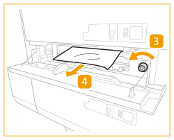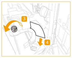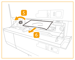 ![]() | Consultați Hârtia se blochează în POD Deck Lite-C (opțional) sau Hârtia se blochează în POD Deck Lite XL-A (opțional) pentru a elimina blocajul de hârtie din „POD Deck Lite” și din magazia de hârtie. |