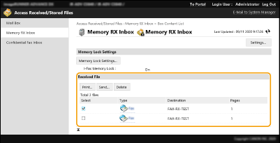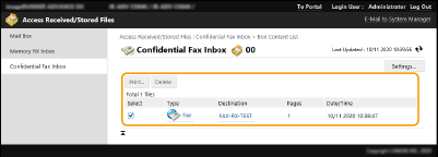 ![]() | Puteți utiliza interfața utilizatorului la distanță pentru a imprima, trimite sau șterge fișiere stocate în căsuța poștală sau I-faxuri stocate temporar în Curierul de intrări I-Fax. |
